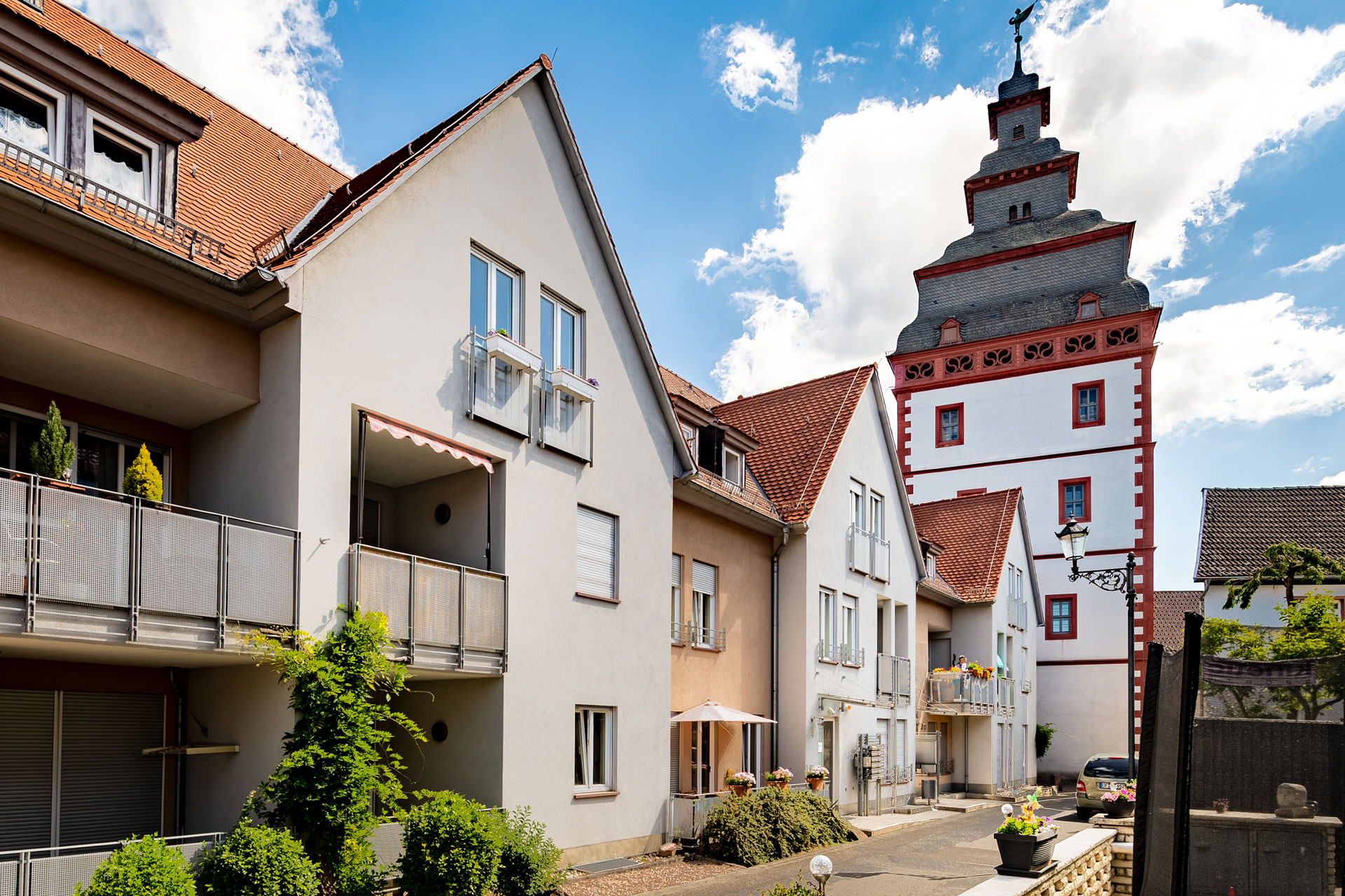 Die Wohngruppe liegt direkt neben dem wunderschönen Steinheimer Tor. Auf der Dachterrasse haben die Bewohner*innen einen herrlichen Ausblick über die Seligenstädter Altstadt.